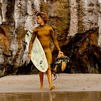 Гидрокостюм с длинными рукавами и короткими штанинами.